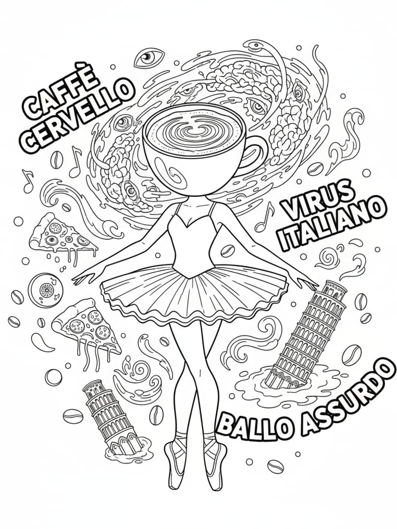 Ballerina Cappuccina with brainrot effect, surreal elements swirling around, clear outlines for coloring
