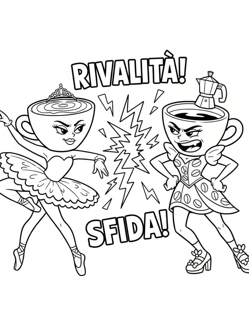 Ballerina Cappuccina and Espressona Signora facing off, rivalry scene, expressive cartoon line art