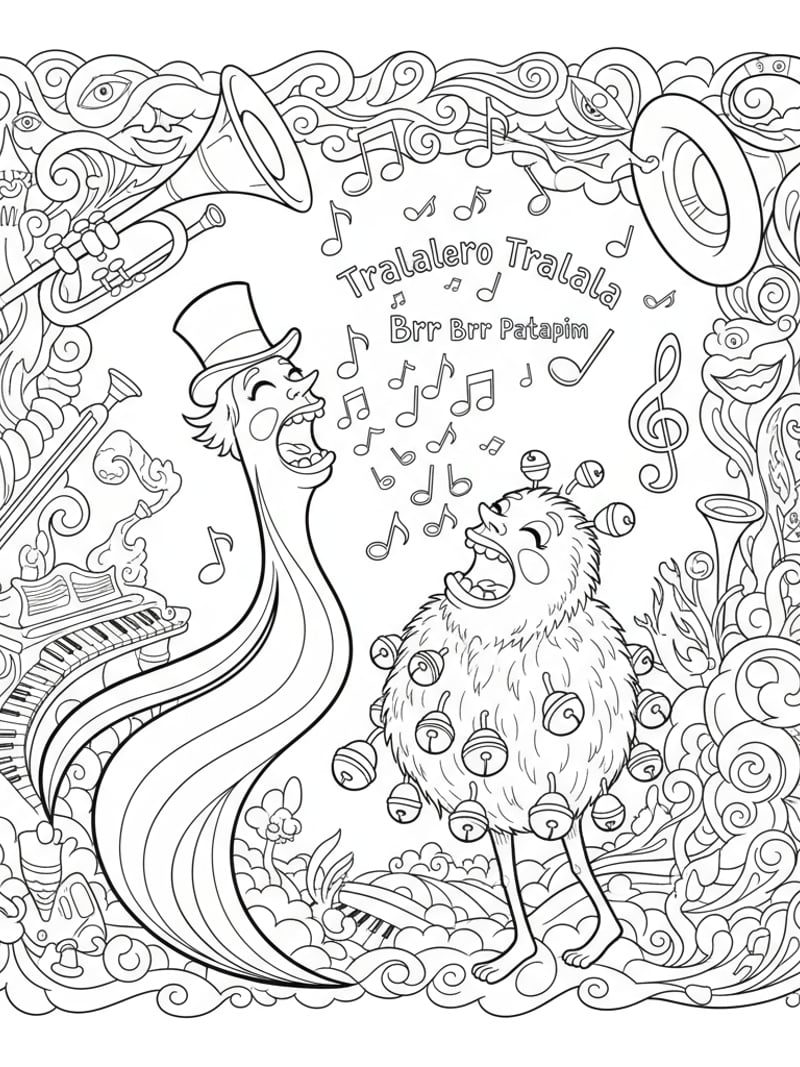 Tralalero Tralala and Brr Brr Patapim characters singing together, with musical notes and a surreal background, suitable for coloring