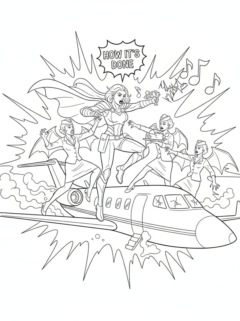 Huntrix fighting demon flight attendants on a private jet while singing 'How It's Done' – dramatic scene for coloring
