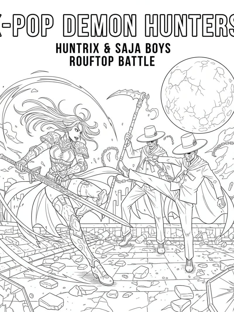 K-pop Demon Hunters Huntrix and Saja Boys face-off in a rooftop battle – manga-style line drawing for coloring