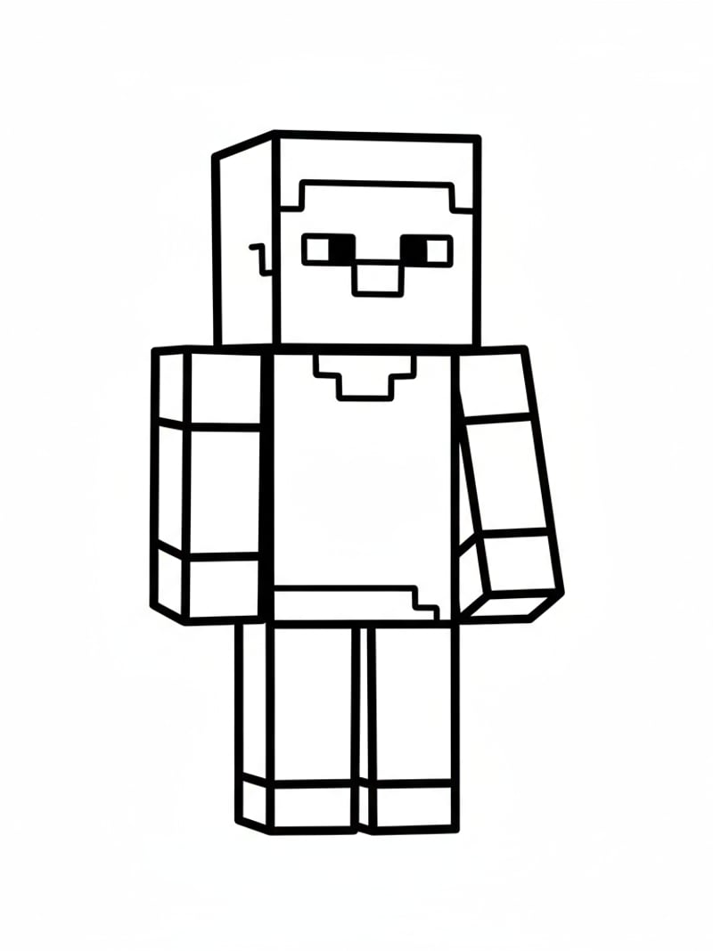 Minecraft character coloring page, black outline drawing, Steve character in pixelated style, simple geometric design, white background