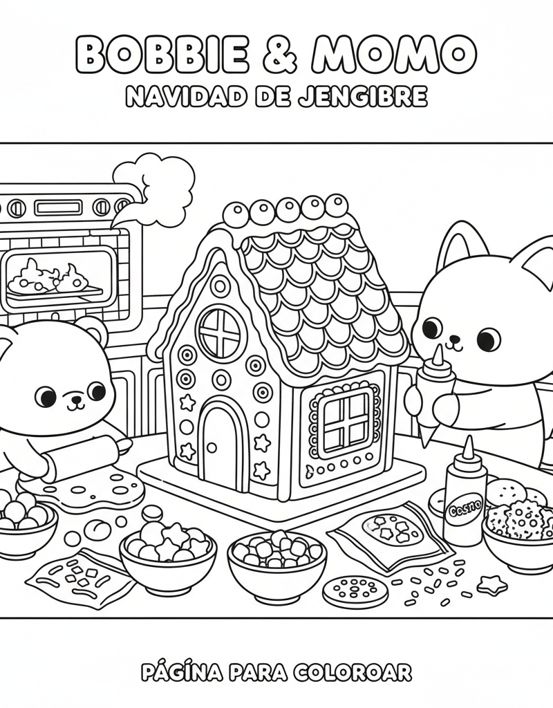 bobbie goods para colorear navidad haciendo casas de jengibre: Bobbie e Momo montando uma casa de gengibre na cozinha, glacê, confeitos, rolinho, tigelas, forno ao fundo; página de colorir, contorno limpo, sem tons de cinza