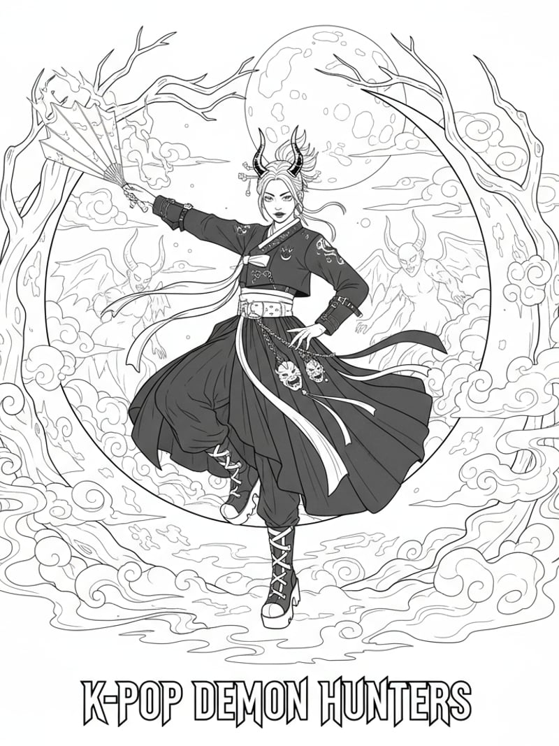 Jinu in traditional black hanbok with modern K-pop twist, performing on a hauntingly beautiful moonlit stage — K-Pop Demon Hunters aesthetic coloring page.