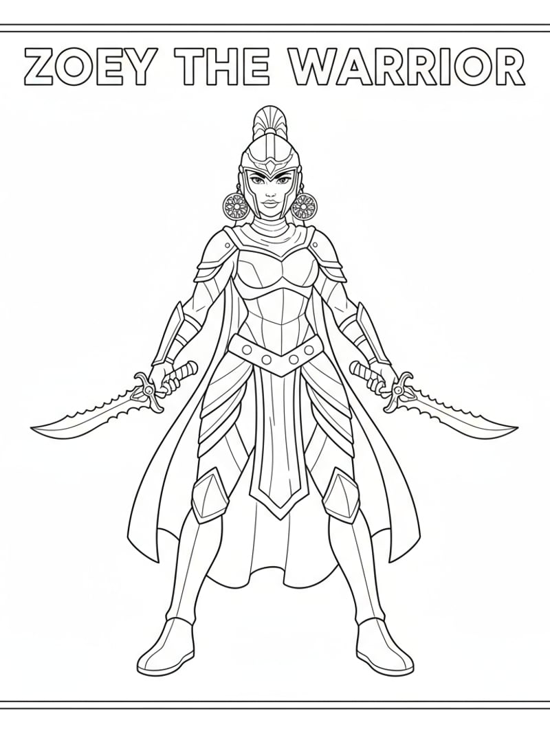 Zoey in her full-body costume with earrings and Shin-Kal daggers, standing confidently. Printable coloring page.