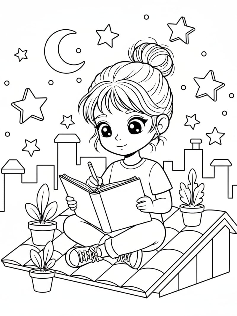 Young Zoey as a child writing lyrics, sitting on a rooftop under the stars. Coloring page in cute anime style.