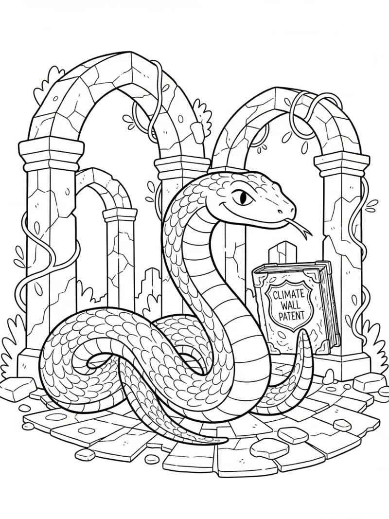 Zootopia 2 coloring page, Gary De'Snake the blue-scaled snake sliding through ancient ruins holding a mysterious old book with the climate wall patent, dramatic stone arches, no color, detailed but clear lines
