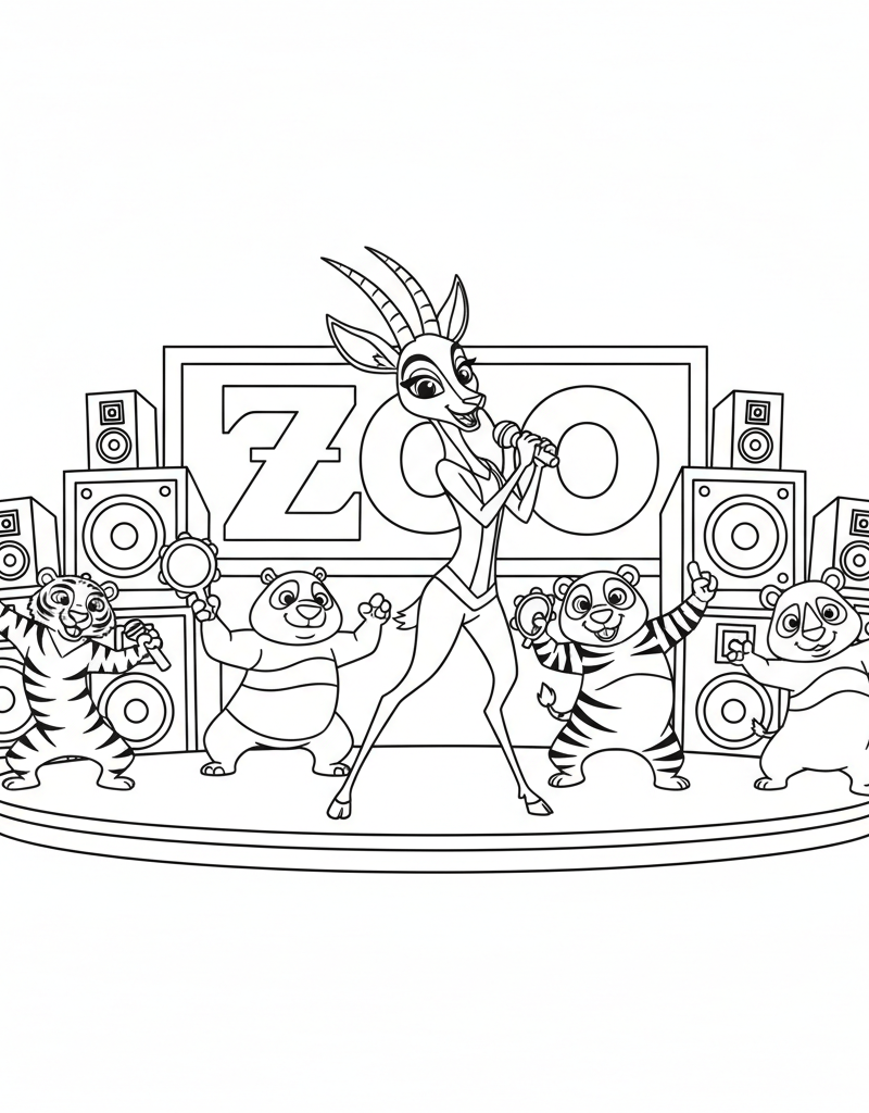 Zootopia 2 coloring page, Gazelle on stage at the Zootopia 2 concert singing theme song "Zoo", backup dancers around her, big speakers and lights, no color, bold outlines